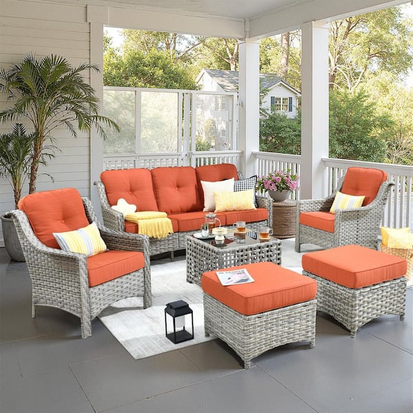 Verona Grey 6-Piece Wicker Modern Outdoor Patio Conversation Sofa Seating Set with Orange Red Cushions