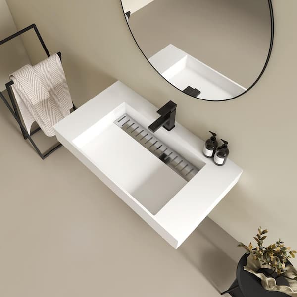 36 x 19 in. Solid Surface Wall Mount Bathroom Vessel Sink with Faucet Hole and Stainless Steels Drain Cover
