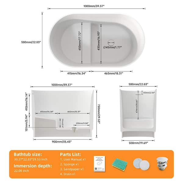 39.4 in. x 22.6 in. Stone Resin Freestanding Soaking Bathtub in White