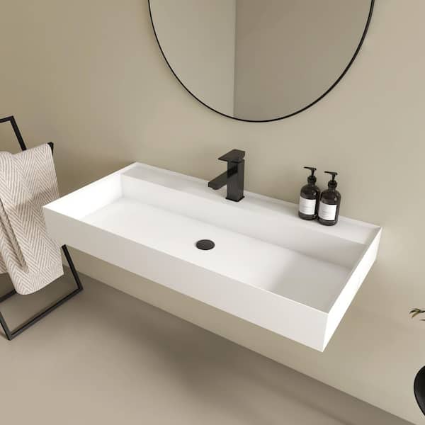 Velin 39 x 19 in. Solid Surface Wall Mount or Countertop Bathroom Vessel Sink with Faucet Holes in Matte White