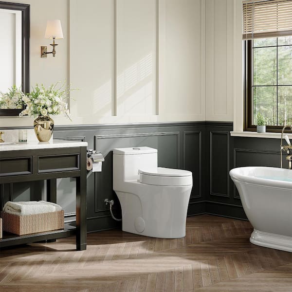 1-Piece 10 in. Rough-In 0.8/1.28 GPF Dual Flush WaterSense Elongated Toilet in White with Lockable Toilet Seat Riser