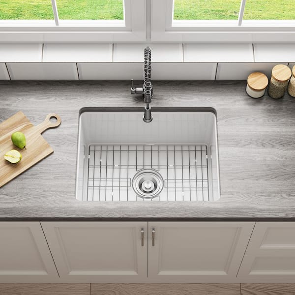 Undermount Fireclay 24 in. Single Bowl Kitchen Sink with Bottom Grid and Strainer in White