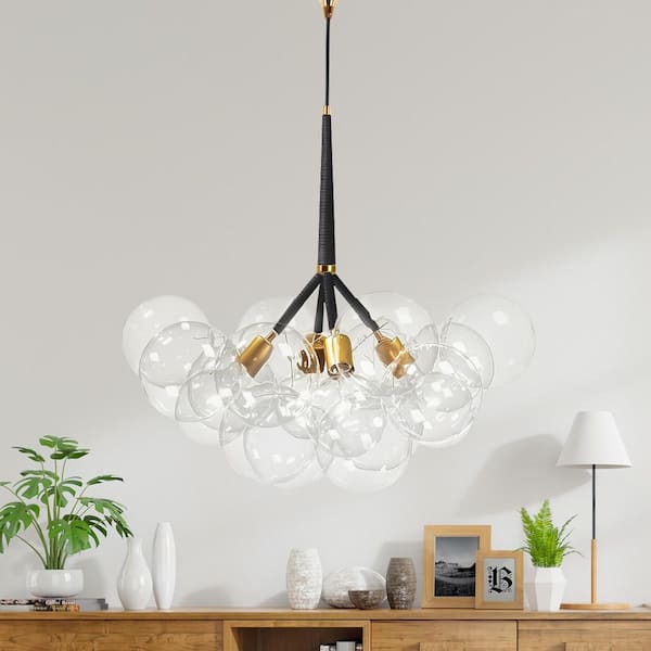 Alma 4-Light 22.8 in.W Gold Bubble Chandelier with Black Leather, 12 Clear Light Glass Globes and LED Bulbs Included