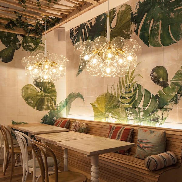 Alma 6-Light 24.8 in.W Gold and White Cluster Bubble Chandelier with Clear Glass and Leather, LED Bulbs Included