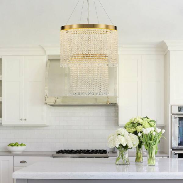 Ciby LED-Light 23.6 in.W Brass Integrated LED Crystal Chandelier Bead Pendant Light 2-Tierd Drum Hanging Light for Hotel