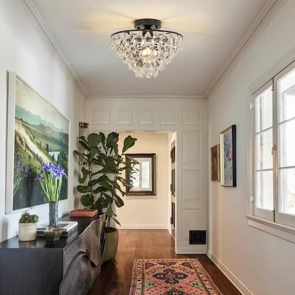Cristal 1-Light 12.6 in.W Matte Black Semi Flush Mount Modern Empire Ceiling Light with Crystal for Kitchen/Hallway