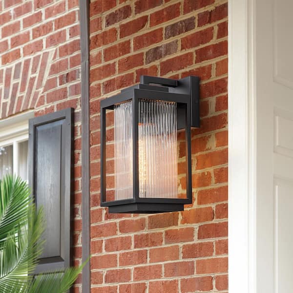 El campo 12.6 in. 1-Light Matte Black Dusk to Dawn Hardwired Outdoor Wall Lantern Scone with Etched Glass (1-Pack)