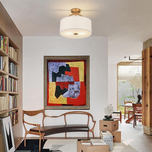 Haven 2-Light 15 in. W Brushed Gold Semi-Flush Mount Round Drum with Fabric and Acrylic Diffuser for Kitchen and Hallway