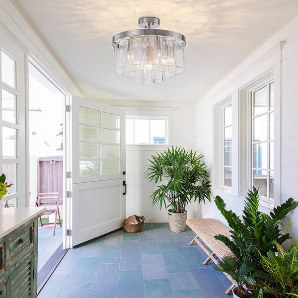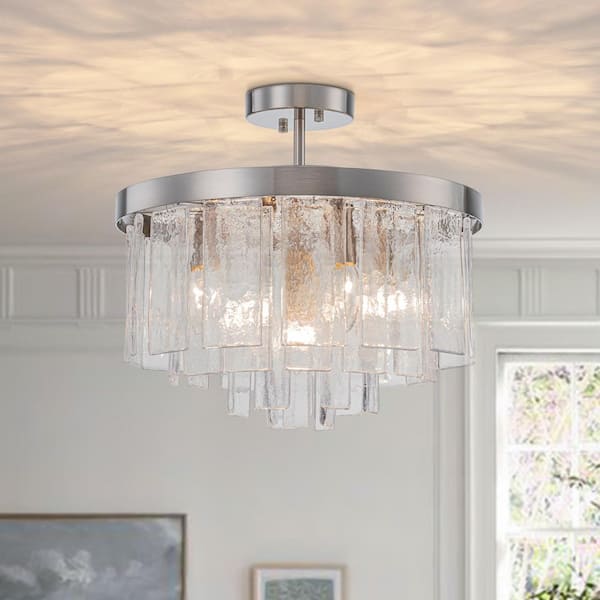 Hielo 5-Light 15.7 in. W Brushed Nickel Semi-Flush Mount Round Hanging Chandelier with Water-Striped Glass