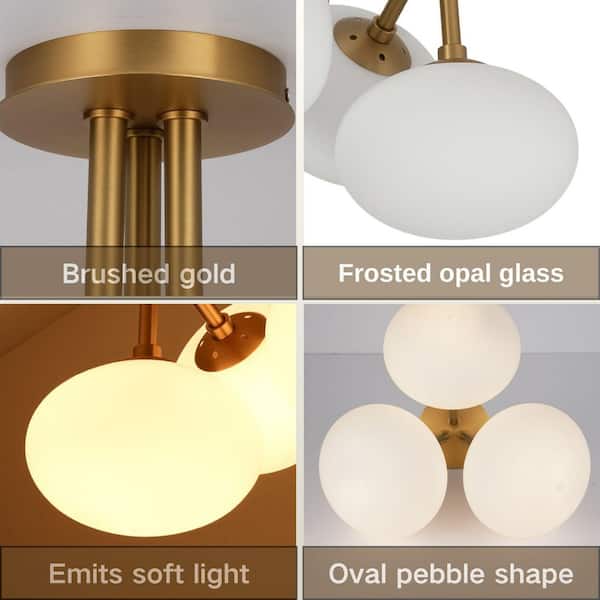 Kza 3-Light 16.9 in. W Brushed Gold Semi-Flush Mount Branch Sputnik Ceiling Light with Oval Opal Glass for Kitchen