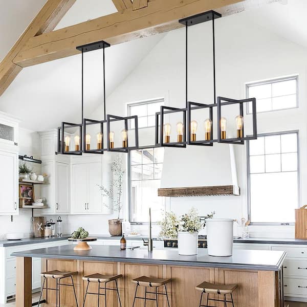 Libertab 6-Light 43.3 in.W Matte Black Chandelier Industrial Rectangular Kitchen Island Hanging Light with Brass Accents