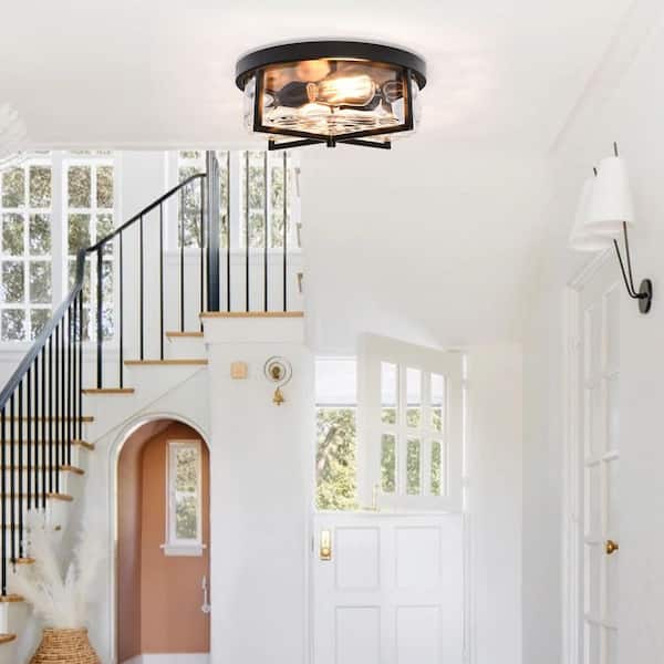 Lumin 13 in. 2-Light Matte Black Drum Flush Mount Farmhouse Ceiling Light with Hammered Glass Shade