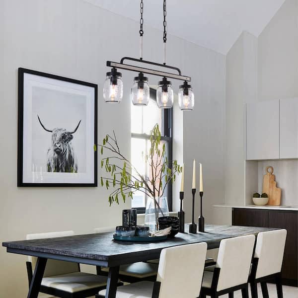 Meise Modern Farmhouse Black Linear Chandelier 4-Light Rustic Mason Jar Island Chandelier Pendant with Faux Wood Accent