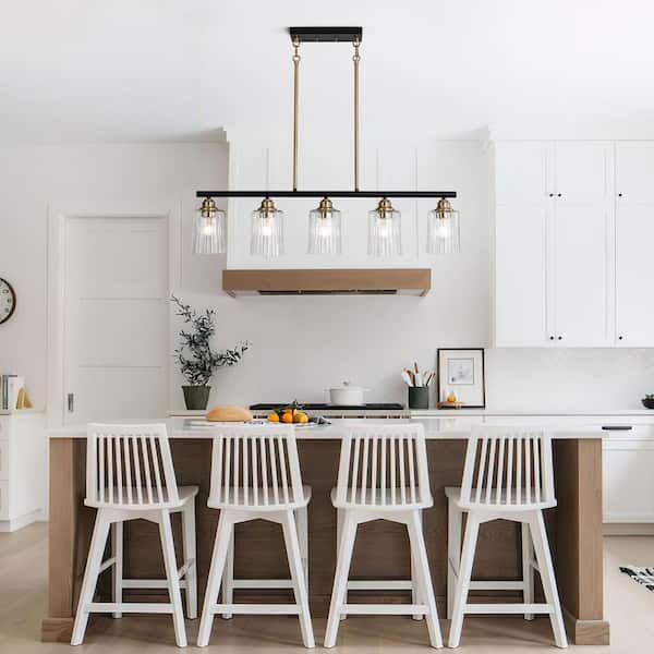 Sierra 5-Light 33.7 in. W Matte Black Chandelier Transitional Bell Pendant with Brass Accents and Pressure Ribbed Glass