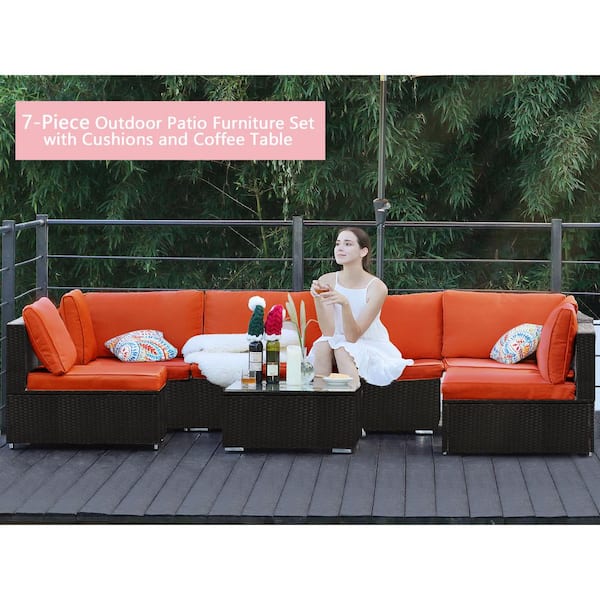 HZY 7-Pieces Black Wicker Outdoor Sectional Set with Orange Cushions and Coffee Table