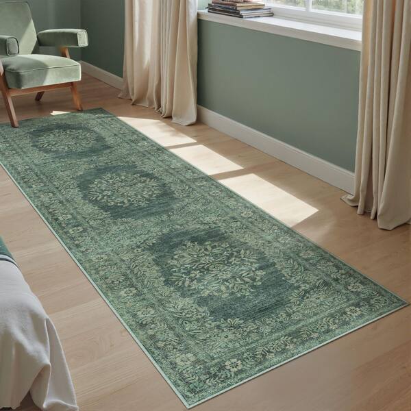 Kamuri Green 2 ft. x 8 ft. Vintage Washable Medallion Distressed Runner Rug