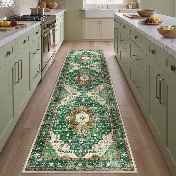 Mandela Green 2 ft. x 8 ft. Vintage Washable Medallion Distressed Runner Rug