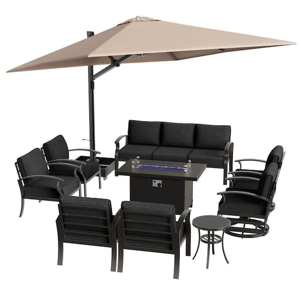 10-Piece Aluminum Patio Conversation Set with Armrest, Firepit Table, Swivel Chairs, Roman Umbrella and Black Cushions