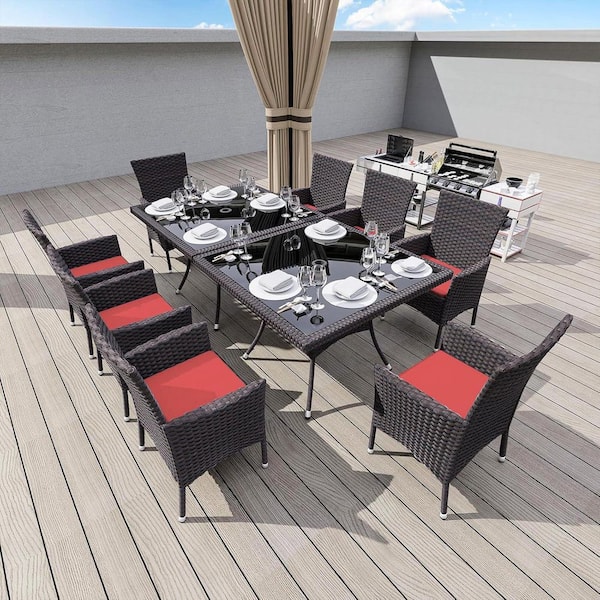 10-Piece Brown Wicker Outdoor/Indoor Dining Set with Red Cushion, Tempered Glass Tabletop, Umbrella Hole