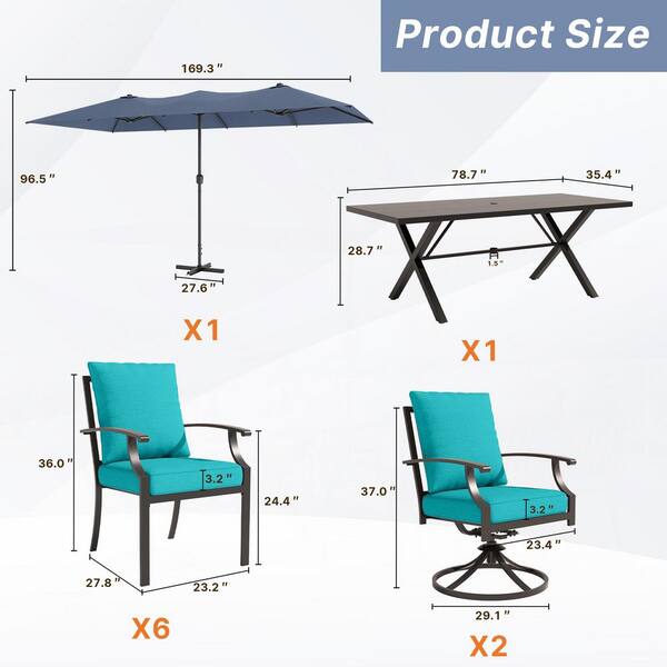 10-Piece Metal Patio Outdoor Dining Set with Swivel Chairs, Rectangular Table, Double-Sided Umbrella and Blue Cushion