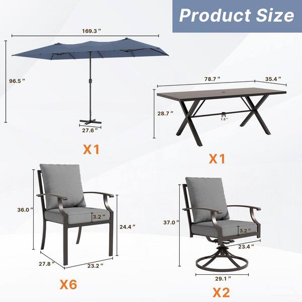 10-Piece Metal Patio Outdoor Dining Set with Swivel Chairs, Rectangular Table, Double-Sided Umbrella and Grey Cushion
