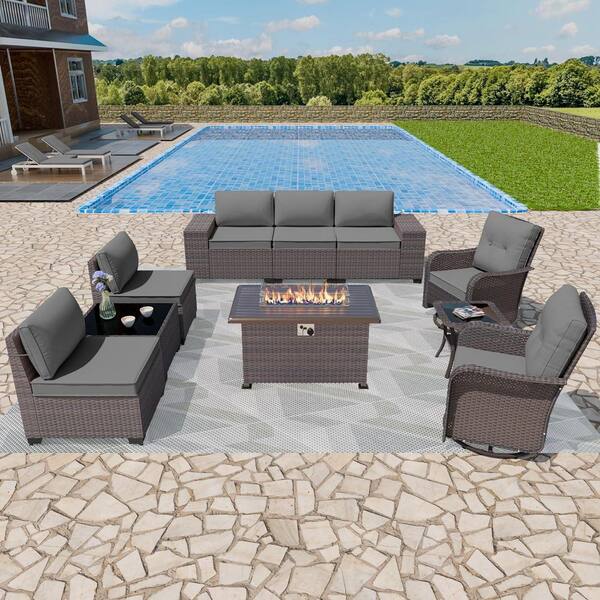 10-Piece Wicker Outdoor Patio Conversation Set with 55000 BTU Propane Fire Pit Table and Swivel Rocking Chairs, Gray