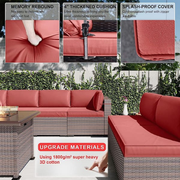10-Piece Wicker Patio Conversation Set with 55000 BTU Gas Fire Pit Table and Glass Coffee Table and Red Cushions