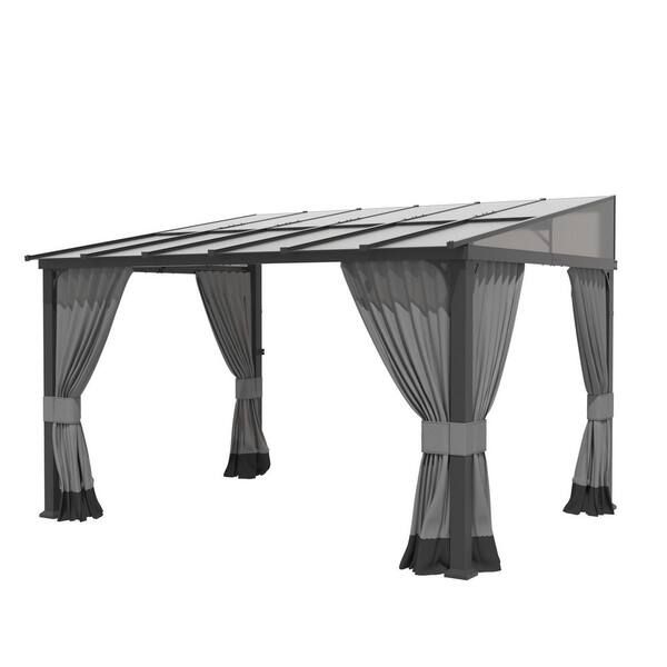 10 ft. x 12 ft. Brown Hardtop Wall Mounted Gazebo with Sloping Pitched Roof and Curtain Gray