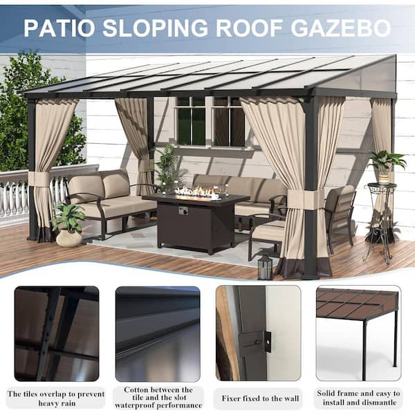 10 ft. x 14 ft. Brown Hardtop Wall Mounted Gazebo with Sloping Pitched Roof and Curtain Sand
