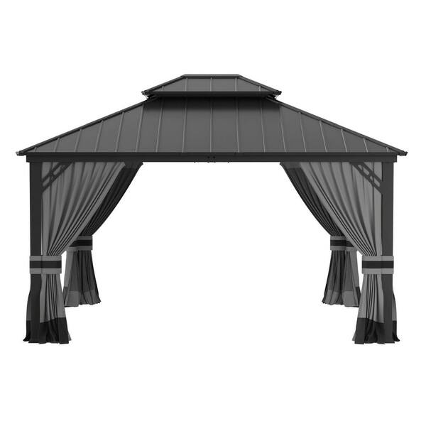 12 ft. x 14 ft. Gray Metal Hardtop Gazebo with Double Roof Pergola, Netting and Curtain Gray