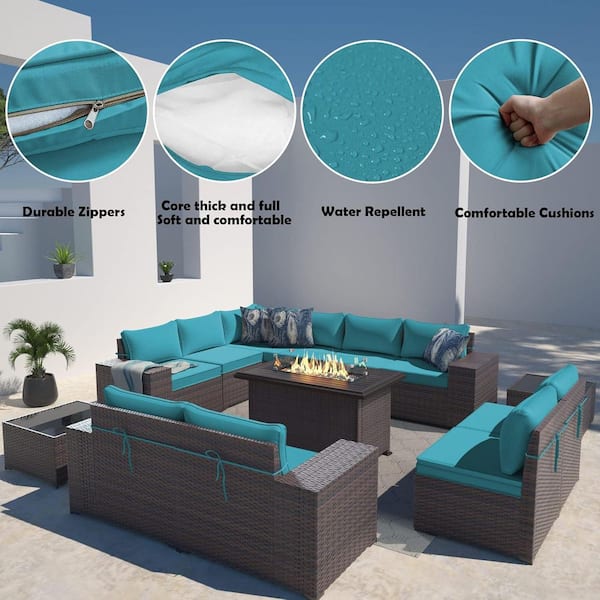 13-Piece Wicker Patio Conversation Set with 55000 BTU Gas Fire Pit Table, Glass Coffee Table, Cushions Blue, Garden
