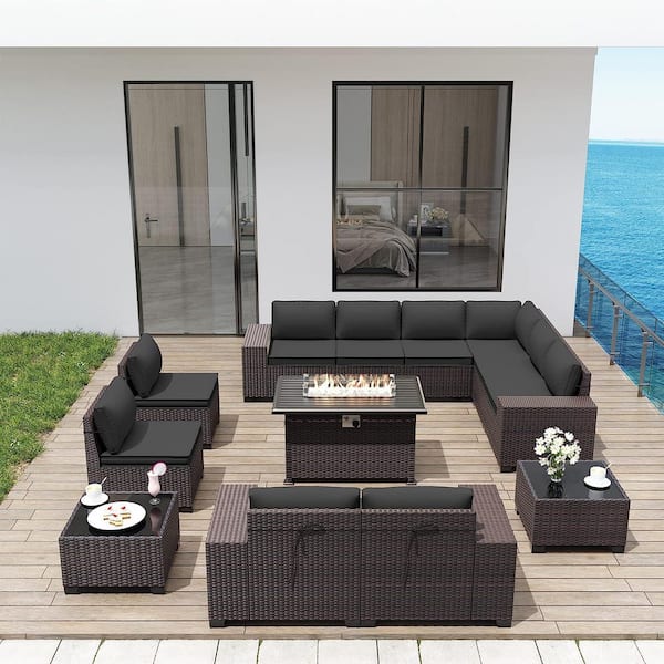 13-Piece Wicker Patio Conversation Set with 55000 BTU Gas Fire Pit Table and Glass Coffee Table and Black Cushions