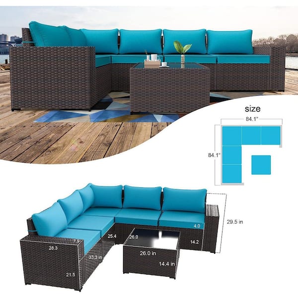 13-Piece Wicker Patio Conversation Set with 55000 BTU Gas Fire Pit Table and Glass Coffee Table and Blue Cushions
