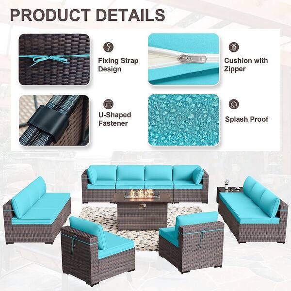 14-Piece Wicker Patio Conversation Set with 55000 BTU Gas Fire Pit Table and Glass Coffee Table and Blue Cushions