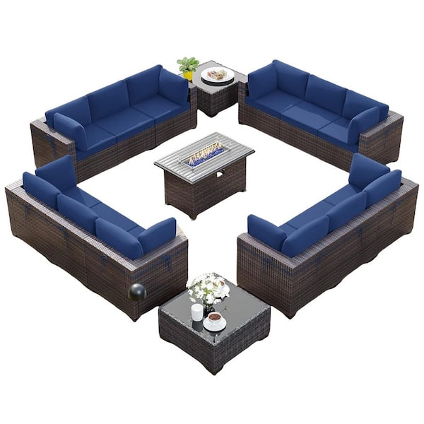 15-Piece Wicker Patio Conversation Set with Coffee Table, Fire Pit Table and Cushion Navy Blue
