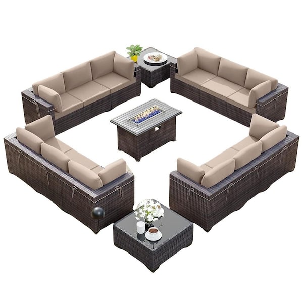 15-Piece Wicker Patio Conversation Set with Coffee Table, Fire Pit Table and Cushion Sand