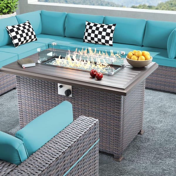 15 Pieces Wicker Patio Conversation Set with Glass Coffee Table, Fire Pit Table and Blue Cushions