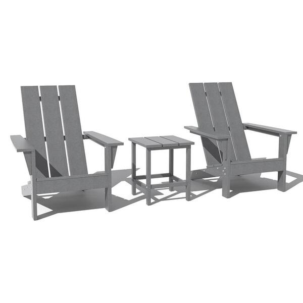 3-Piece Grey Weather Resistant Classic HDPE Poly Plastic Outdoor Adirondack Chair Set with 2 Chairs and Side Table