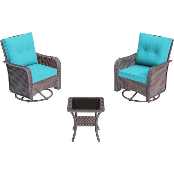 3-Piece Wicker Swivel Outdoor Rocking Chairs with Coffee Table and Cushion Blue
