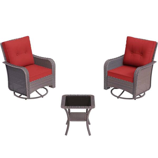 3-Piece Wicker Swivel Outdoor Rocking Chairs with Coffee Table and Cushion Red