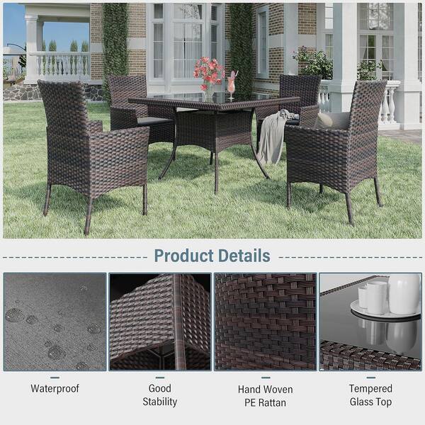 5-Piece Brown Wicker Outdoor/Indoor Dining Set with Grey Cushion, Tempered Glass Tabletop, Umbrella Hole