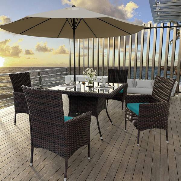 5-Piece Wicker Square Patio Outdoor Dining Set with Glass Tabletop and 1.5 in. Umbrella Hole, Blue Cushion