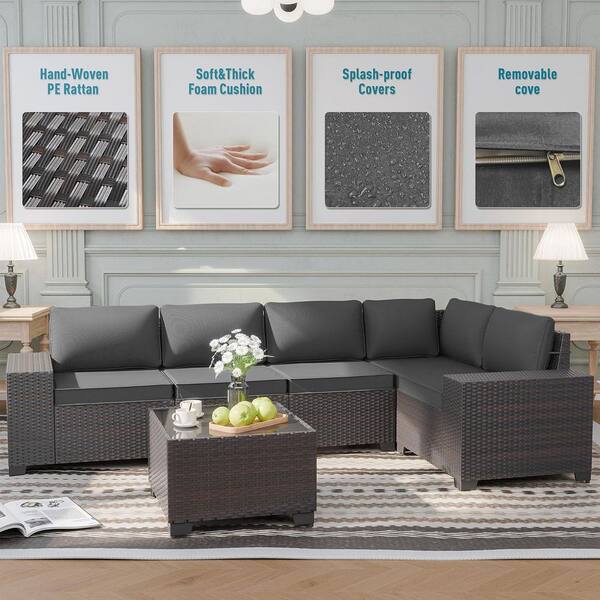 6-Piece Wicker Outdoor Sectional Set with Glass Coffee Table and Black Cushions