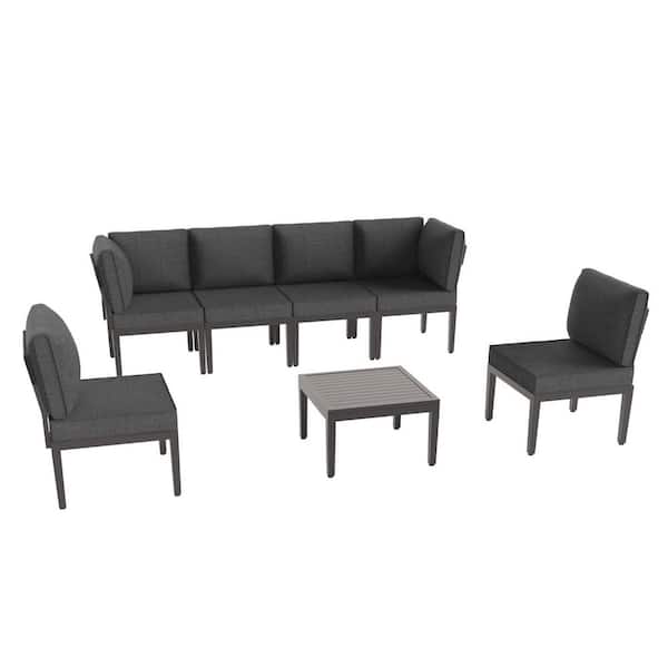 7-Piece Black Metal Patio Conversation Set with Black Cushions, Coffee Table