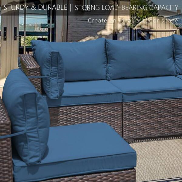 7-Piece Wicker Outdoor Patio Furniture Sectional Set with Navy Blue Cushions and Coffee Table