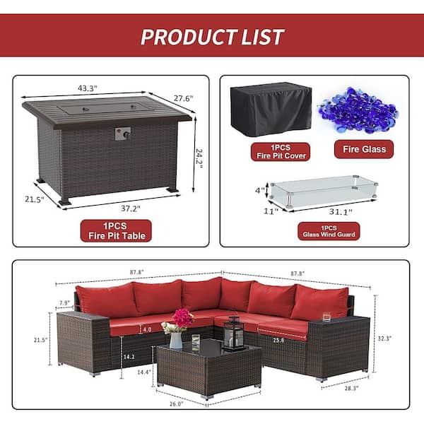 7-Piece Wicker Patio Conversation Set with 55000 BTU Gas Fire Pit Table and Glass Coffee Table and Red Cushions