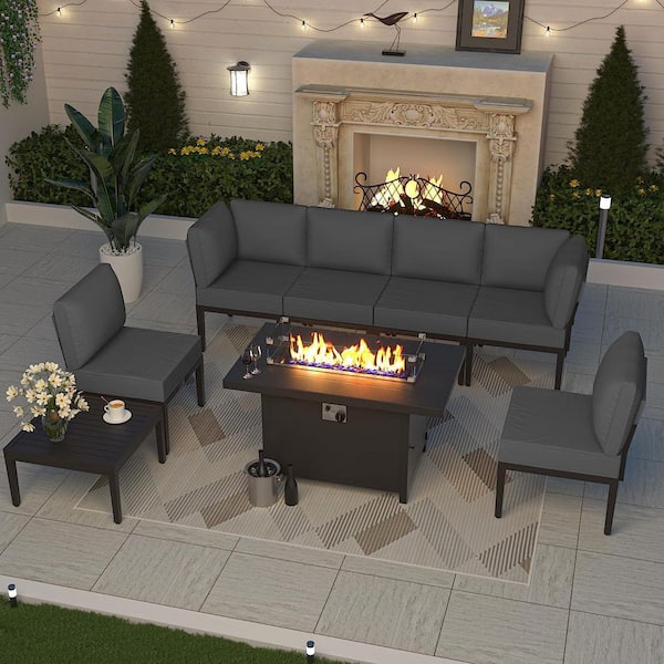 8-Piece Metal Patio Conversation Set with 55000 BTU Gas Fire Pit Table and Glass Coffee Table and Grey Cushions