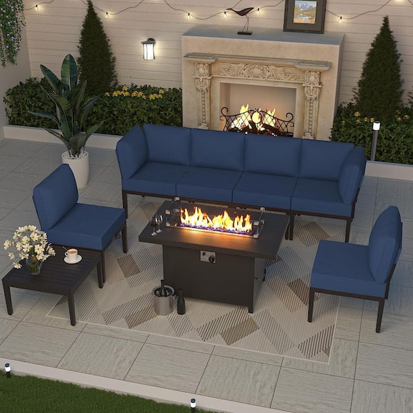 8-Piece Metal Patio Conversation Set with 55000 BTU Gas Fire Pit Table and Glass Coffee Table and Navy Cushions