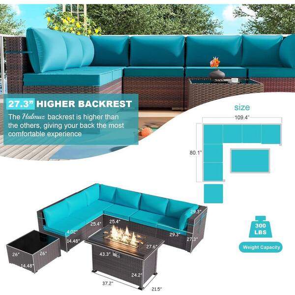8-Piece Wicker Patio Conversation Set with 55000 BTU Gas Fire Pit Table and Glass Coffee Table and Blue Cushions