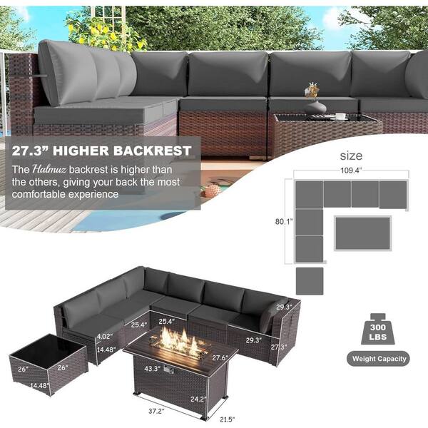 8-Piece Wicker Patio Conversation Set with 55000 BTU Gas Fire Pit Table and Glass Coffee Table and Grey Cushions